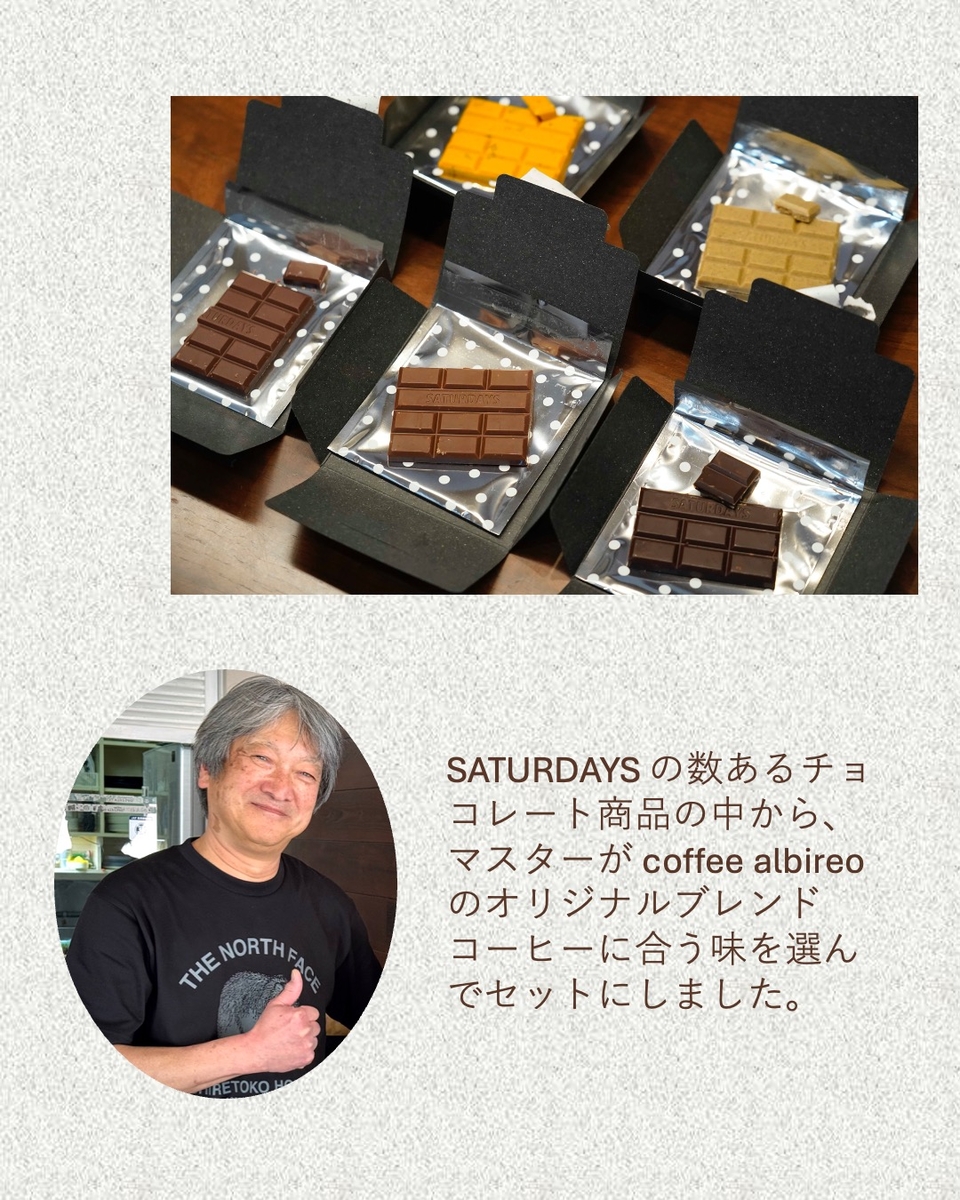coffee albireo のドリップバッグコーヒーと、札幌のBean To Bar Chocolate 専門店 SATURDAYSのチョコレートのプチギフトセットです。SATURDAYSの数あるチョコレート商品の中から、coffee albireoのマスターがそれぞれのオリジナルブレンドコーヒーに合う味を選んでセットにしました。